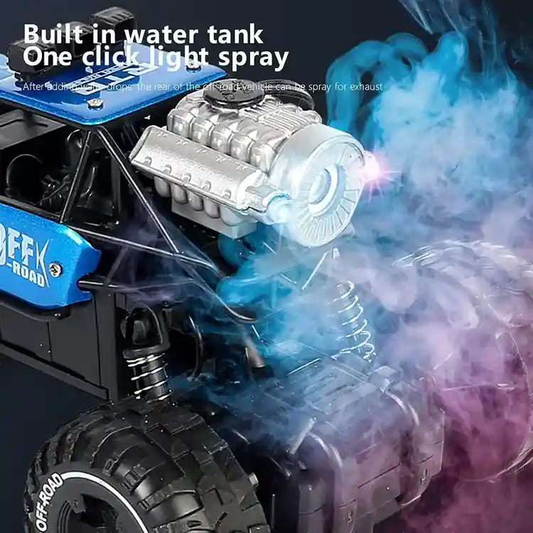 این ماشین کنترلی باگی دودزا کوچک مجهز به سیستم مه پاش (اسپری بخار) با نورپردازی LED است که جلوه خیره کنندهای را در حین بازی ایجاد میکند . کافیست در بطری کوچک آن آب بریزید تا مه خنکی از انتهای ماشین خارج شود که زیر نور LED دقیقاً مانند شعله دم یک ماشین مسابقهای دیده میشود!